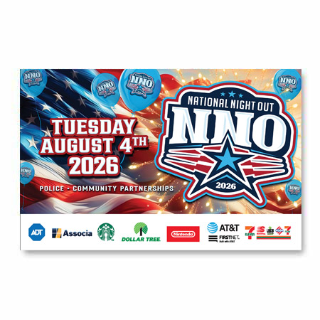 The official National Night Out vinyl banner measures 6′ wide by 4′ tall with a full color process, suitable for indoor or outdoor use. Heavy sewn hemmed edges with four brass grommets positioned at corners with 6′ rope extensions for easy display.