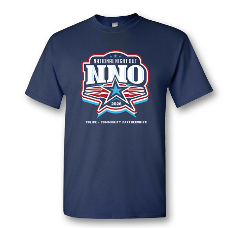 Celebrate with the official National Night Out short sleeve shirt. A full color logo imprinted on a comfortable and durable light blue tee made from a 50% cotton 50% polyester blend. Moisture-wicking shirt is cool, dry and comfortable.